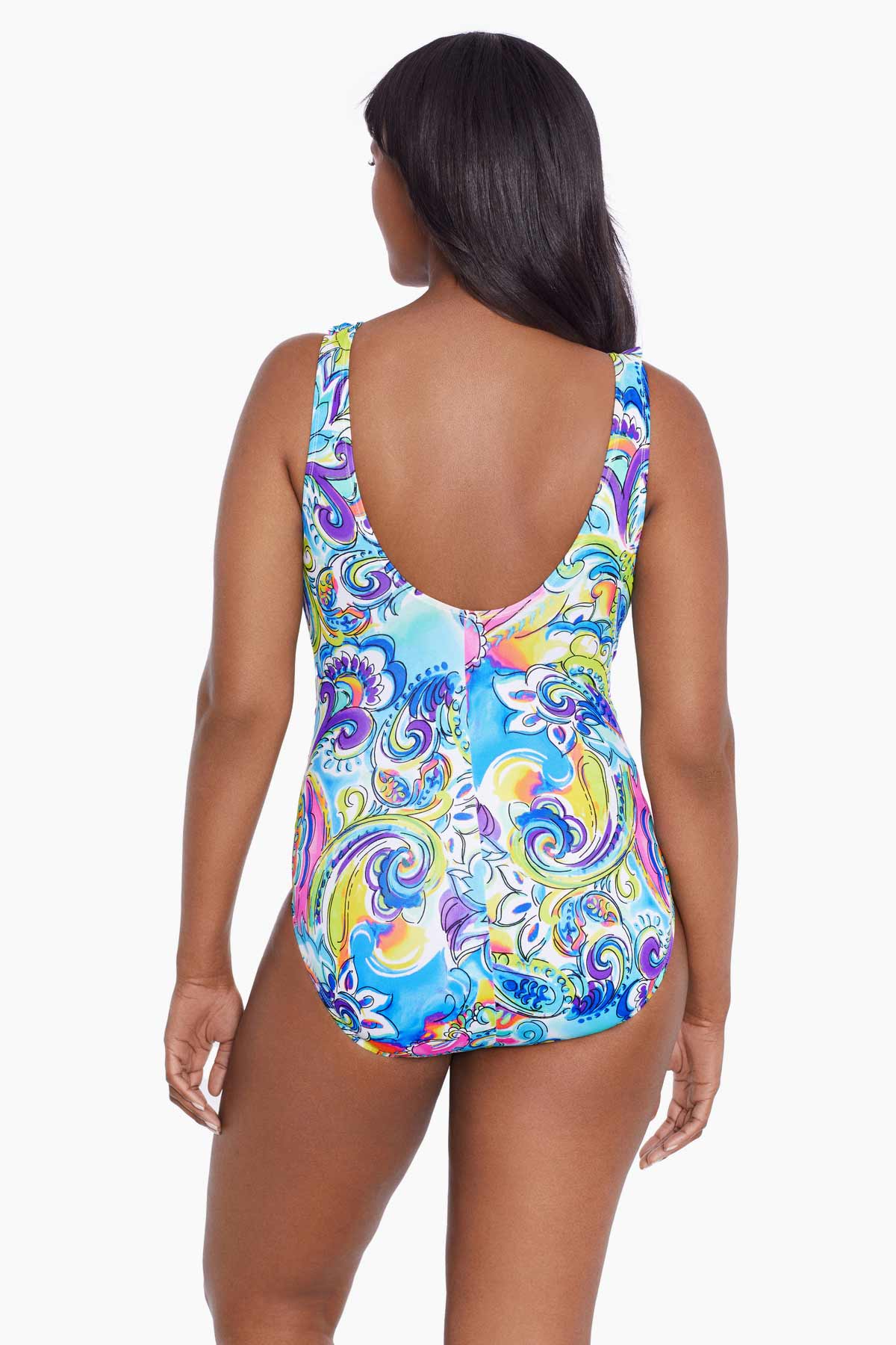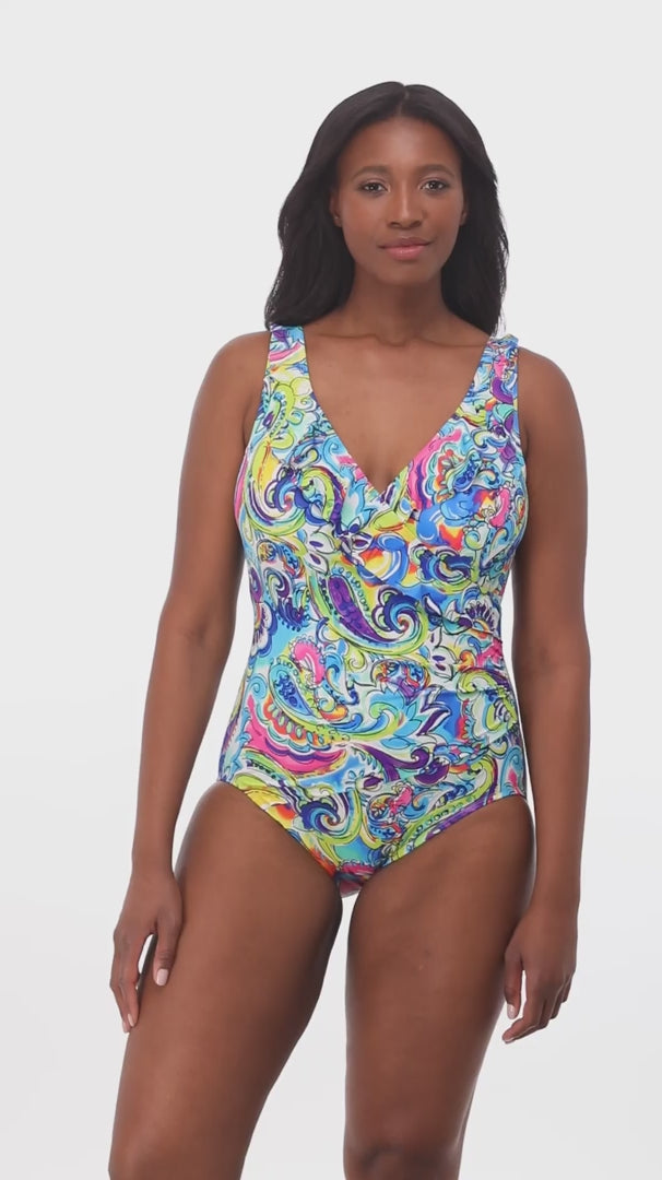 Long Torso Ruffle Front Surplice One Piece - Paisley Seas