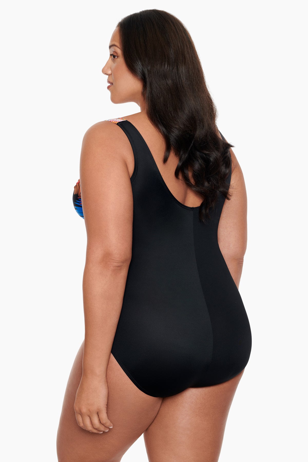 The Inner firming shapewear in the Plus Size Jungle Boogie Side Tie Draped Surplice Long Torso One Piece Swimsuit offers all day comfort while colorful prints and signature solid black styles grace this ageless swimwear. A longer length and finer fit enhance all figures, embracing confidence within.