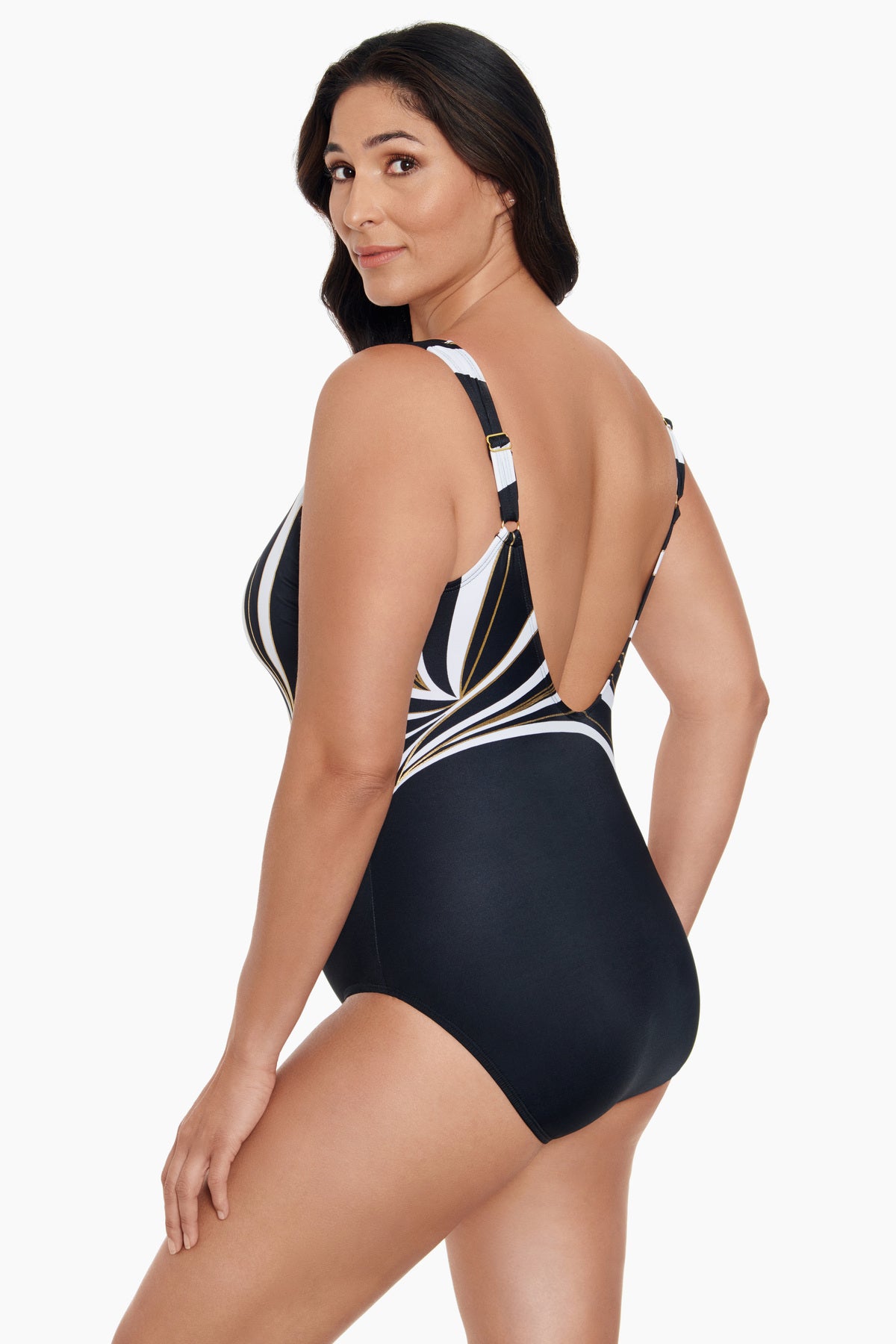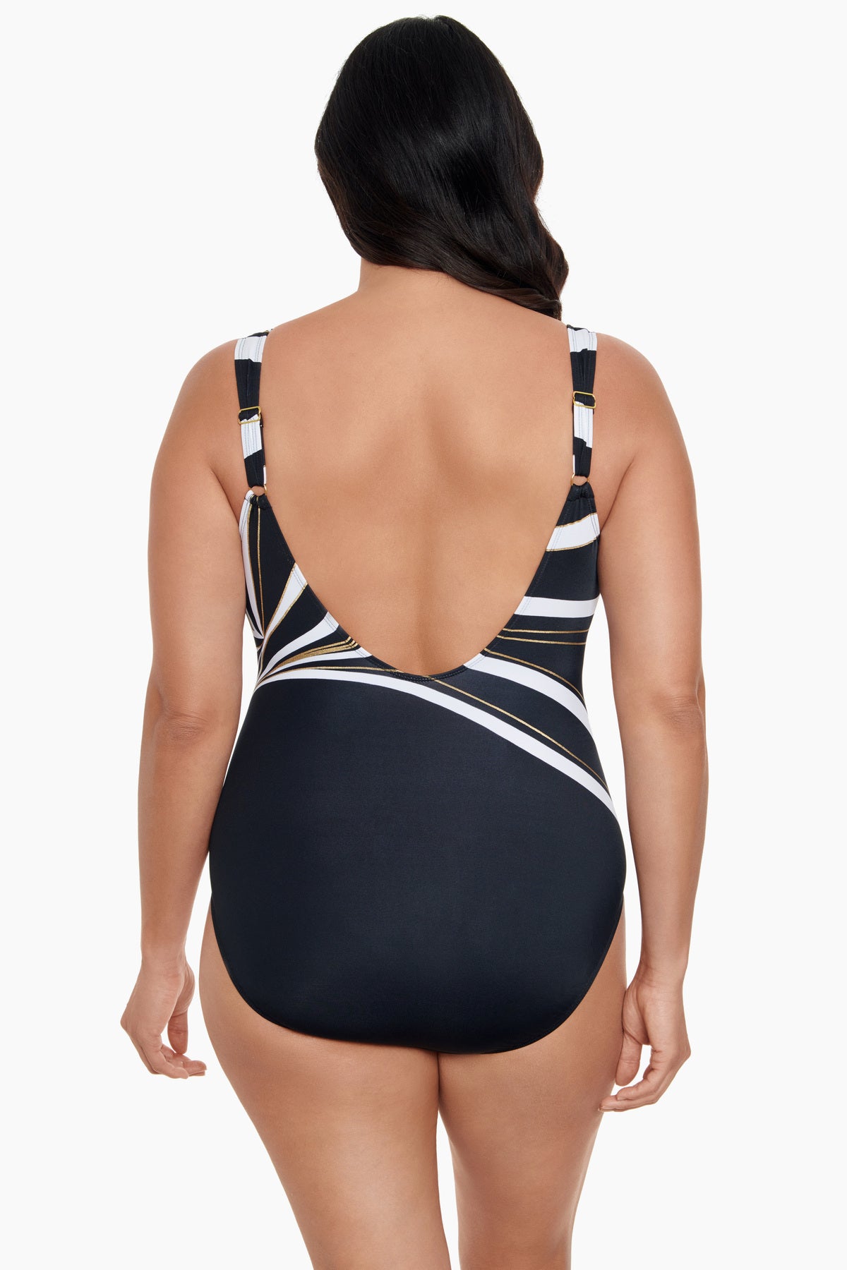 Panel Scoop Neck Tank One Piece Swimsuit W/Hardware Dangerous Curves #L220409 Inner firming shapewear in each Longitude swimsuit offers all day comfort while colorful prints and signature solid black styles grace this ageless swimwear. A longer length and finer fit enhance all figures, embracing confidence within.