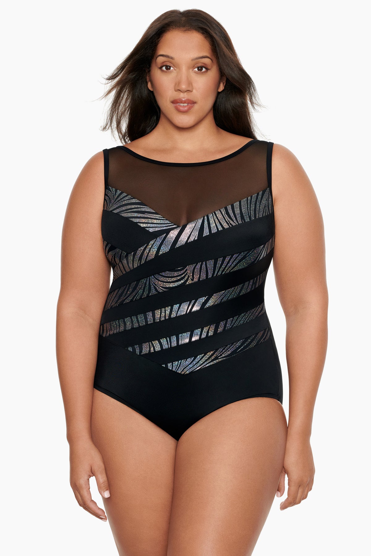 Dive into style and confidence with our Longitude Plus Size Mesh Highneck Long Torso One Piece Swimsuit, available exclusively at Longitudeswim.com! Introducing the Party Animal, this swimsuit is designed to elevate your beachwear experience. Enjoy the perfect blend of fashion and function with features like a soft cup bra for comfort and support, a chic high neckline for added flair, and secure straps that keep everything in place.