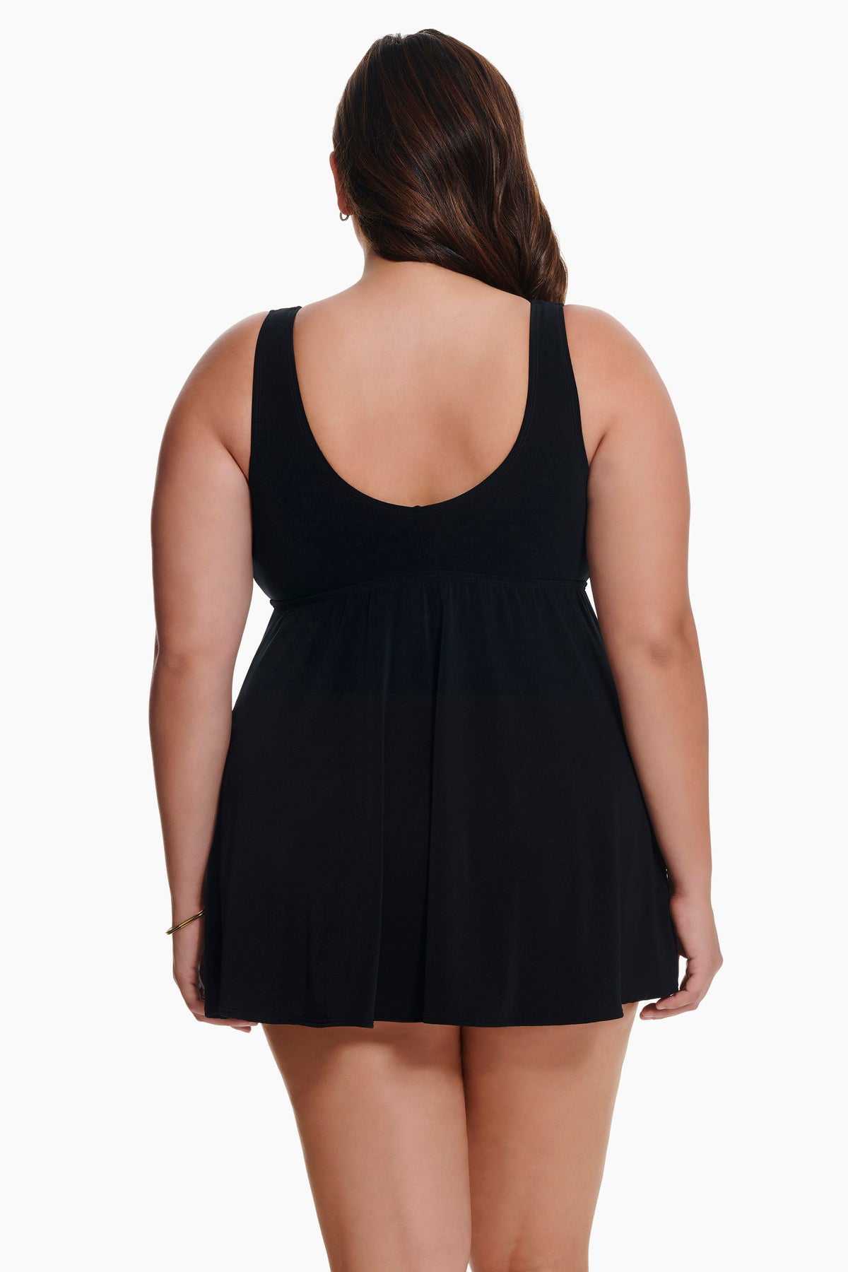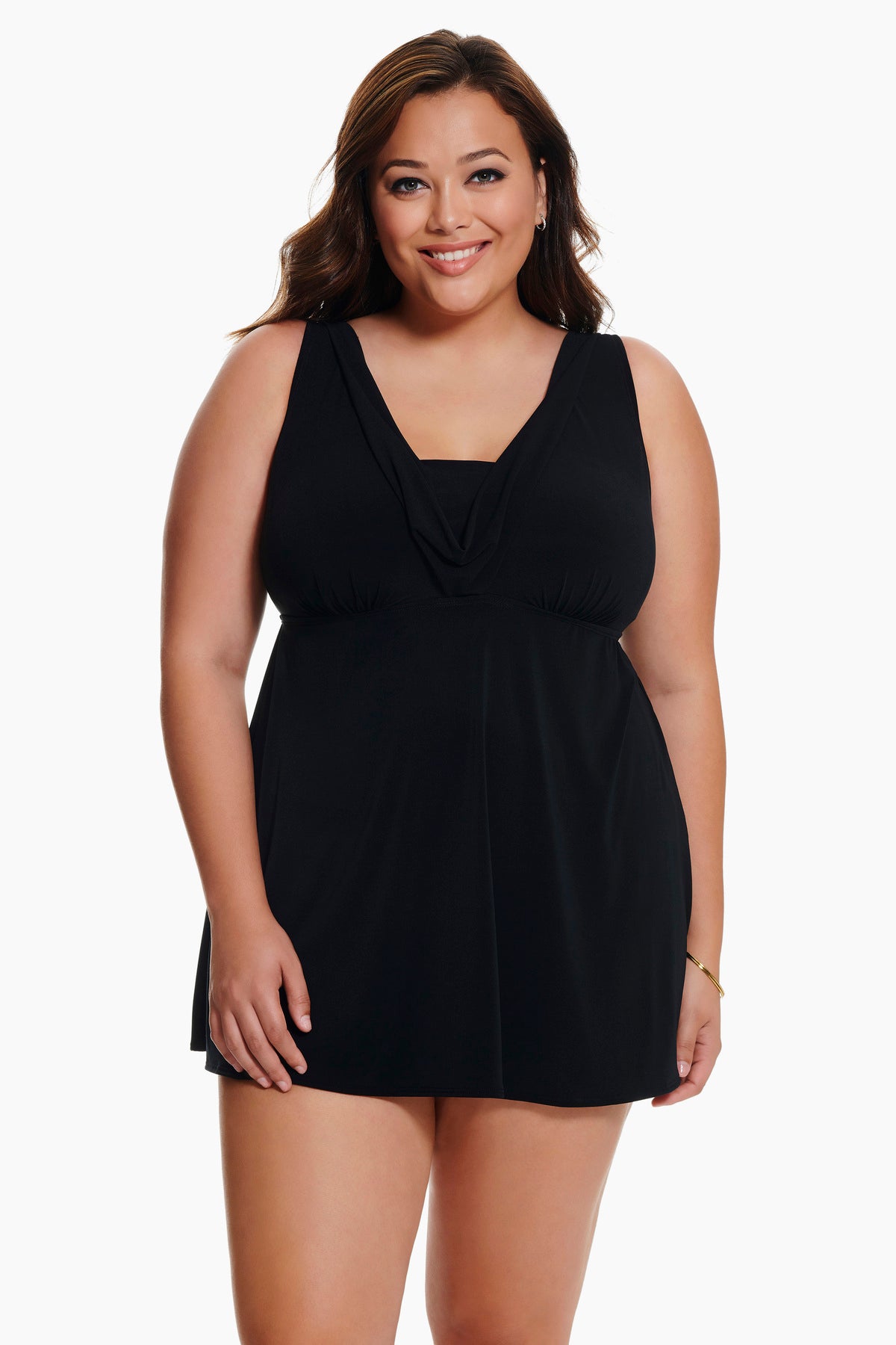 Black Tie Plus Size Long Torso Cowl Neck Swim Dress