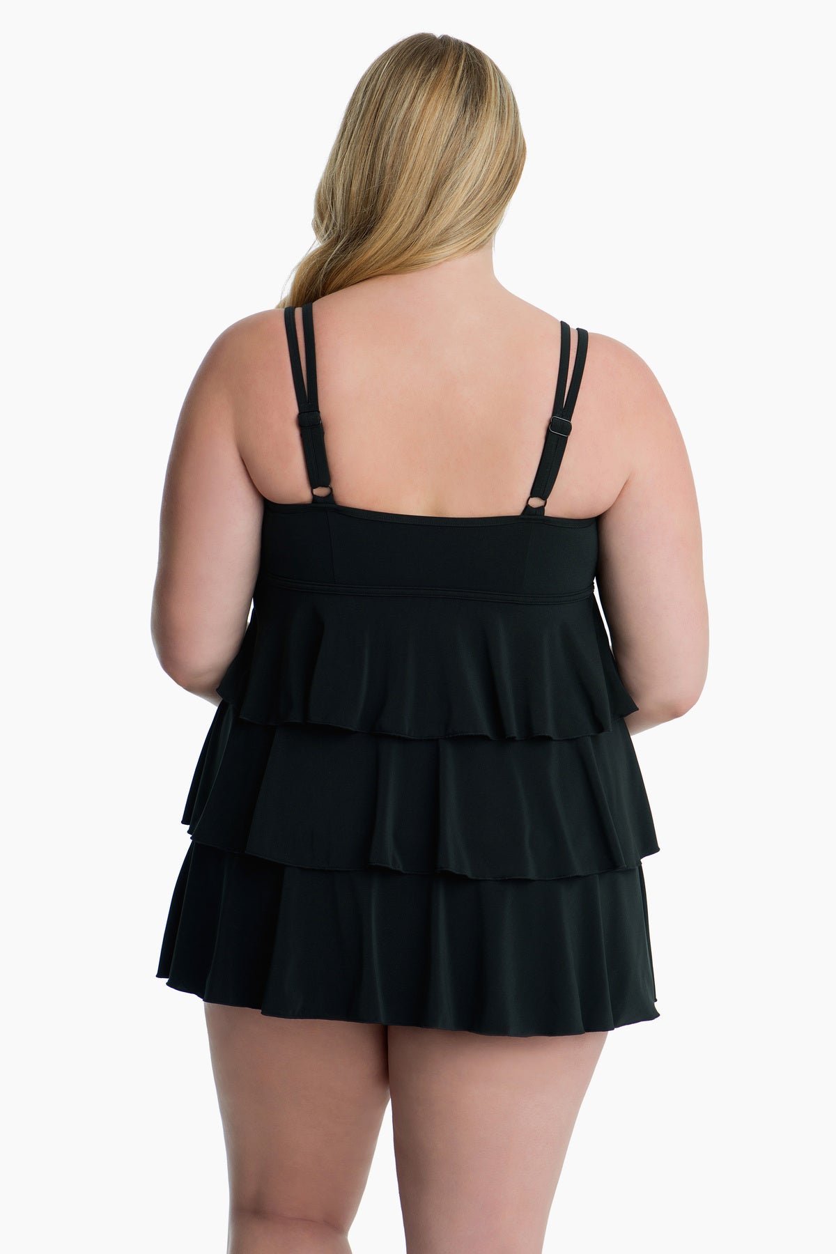 Plus Size Long Torso Triple Tier Swim Dress - Black Tie