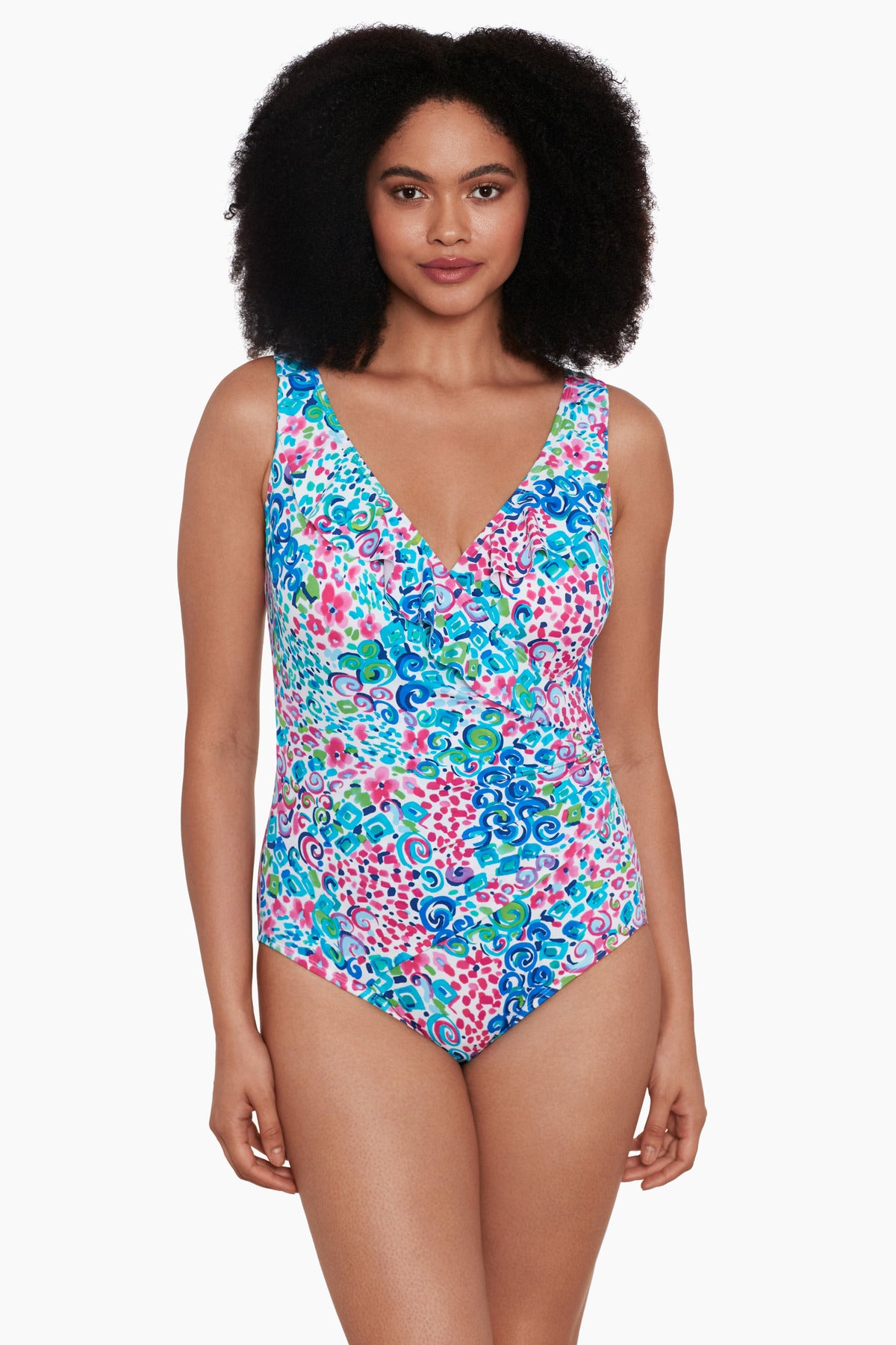 If you're seeking a swimsuit with a feminine flair, look no further than our Ruffle Front Surplice swimsuit. The delicate ruffles along the surplice neckline evoke a romantic and whimsical vibe, while the low scoop back and built-in soft cups ensure excellent support and coverage. The vibrant pattern adds an extra dash of fun, making this swimsuit a captivating choice that prioritizes comfort and support. From the Soft Cup Bra design to the sultry low back, this classic one-piece is anything but ordinary. Our customers adore the ruffled V-neckline, fixed straps, and stylish moderate leg cut, ensuring you stay covered whether you're swimming laps or soaking up the sun.