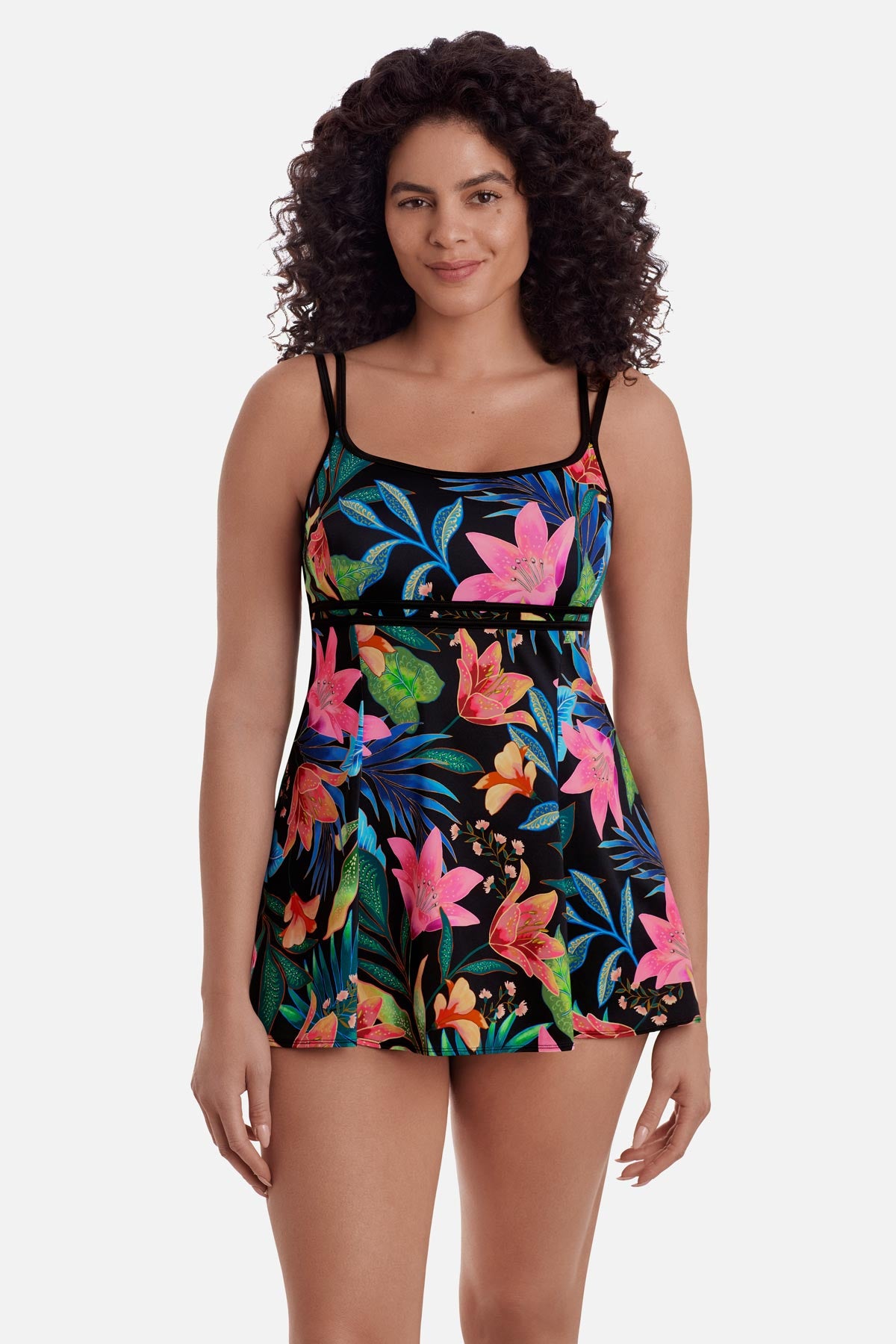 Plus Size Long Torso Empire Princess Seam Swim Dress - Midnight Plumeria Black/Multi
