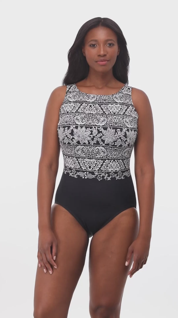 Inner firming shapewear in each Longitude swimsuit offers all day comfort while colorful prints and signature solid black styles grace this ageless swimwear. A longer length and finer fit enhance all figures, embracing confidence within.